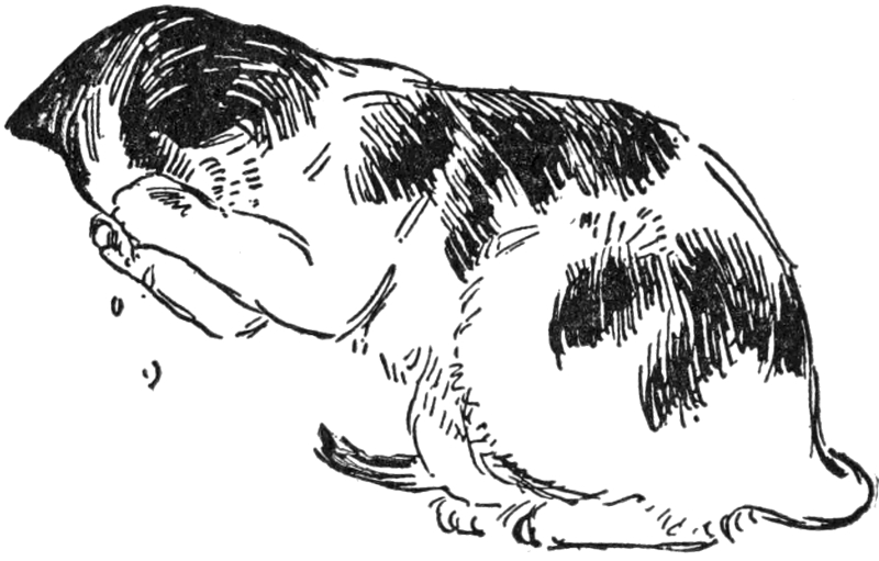 Now Ban-Ban loved his little master very much—not that he ever thought of him as his “master;” no cat ever would admit having a master. Ban-Ban considered the little boy as a friend whom he, a prince of the Maltese Royal Family, allowed to play with him. He was more useful than kitten friends because he could open doors, drag strings around, hide sticks under the edges of rugs, get milk from the refrigerator, cut up meat, play hide-and-go-seek better than cats, and shake up soft knitted things into fine beds on cold days, besides scratching a person under the chin and on the side of the cheek in a way that made a person stick out his little red tongue and purr, no matter how much he felt like playing. But that is not having a master; that is really keeping a very useful and devoted servant. Ban-Ban hated of all things to show that he loved little Rob; he liked to pretend that he was only polite to him, and often, when he meant to get up in Rob’s lap for a little talk, if Rob saw him coming, Ban-Ban would sit down and wash his face, trying to look as if he had never once thought of being loving. You see he was independent.