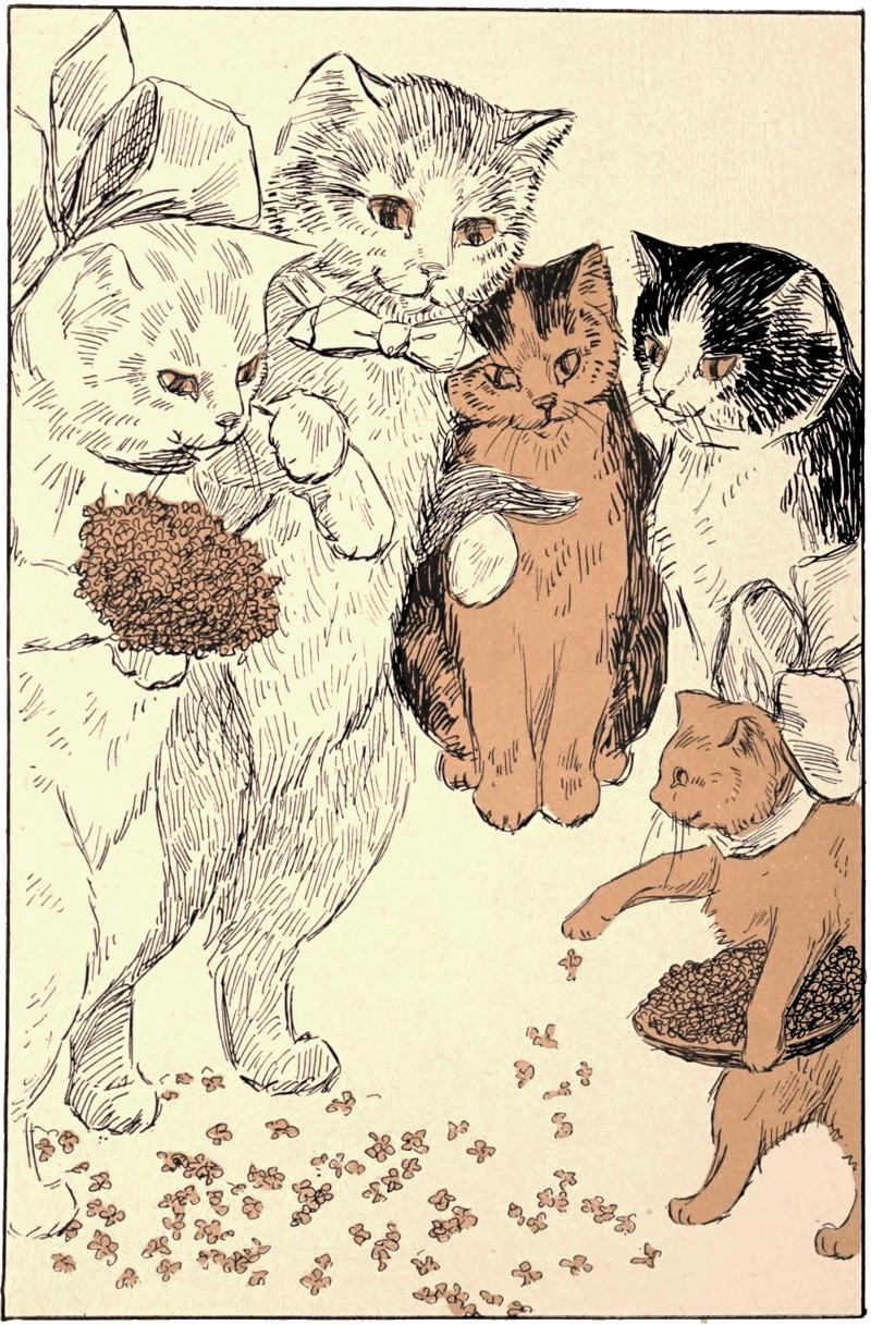 Tommy Traddles stood on the platform waiting the bridal procession. It entered the hall, preceded by Puttel and Dolly Varden, in immense white bows, as bridesmaids, and following them came Nugget, also in a white bow bigger, far, than his head, scattering catnip blossoms before the happy couple’s softly falling, padded feet.