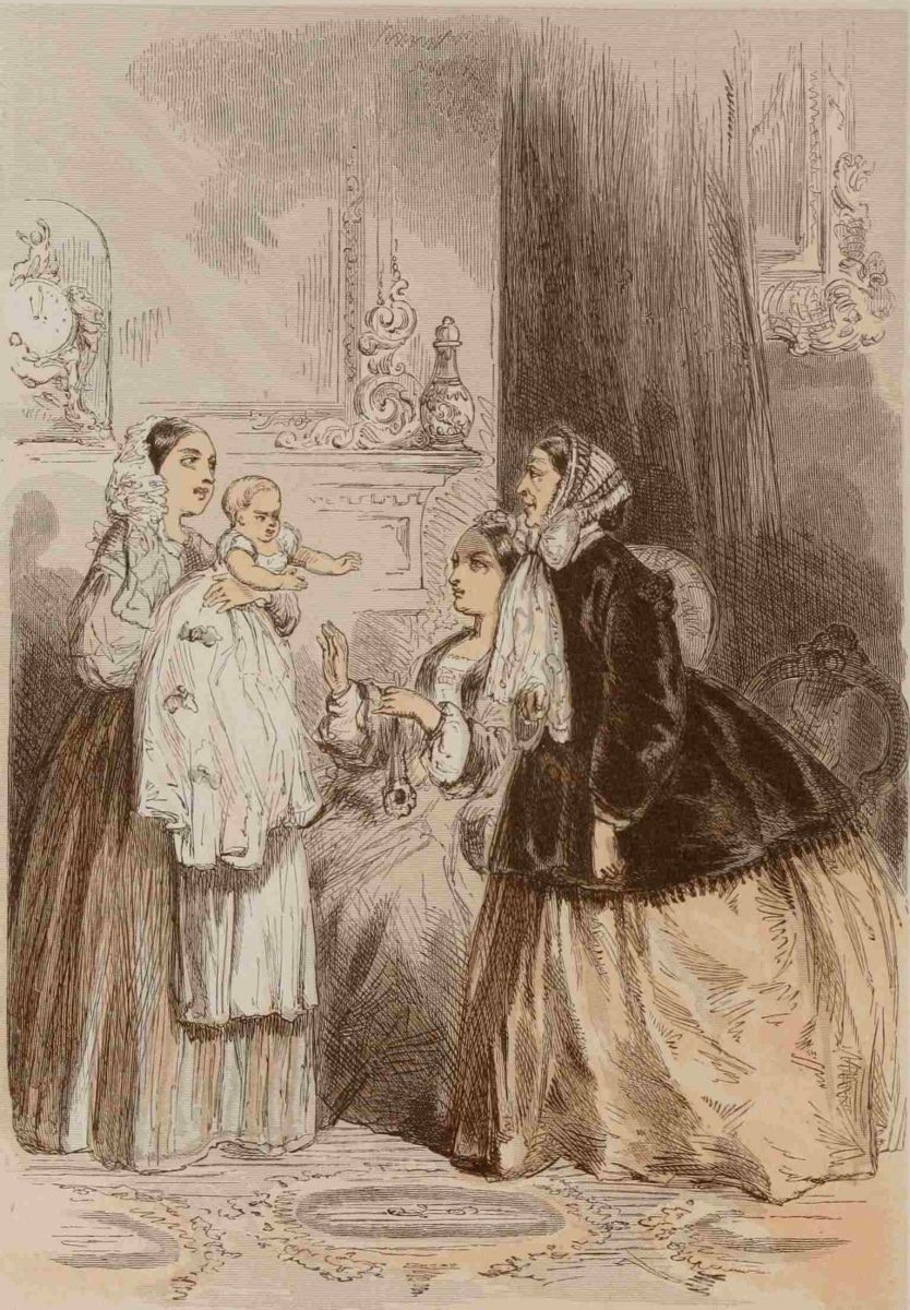 Passing thus briefly over the earliest phase of motherly duty, we come to the education of the living, breathing, “necessary evil,” or cherished blessing, as the parent’s taste or principles may determine the little stranger to be. The pink, plump, piping bantling has been exhibited to the usual round of ceremonious visitors, and passed muster with all—in the mother’s hearing—having been praised by one as the image of his papa, and by another, no less discerning, as his mother’s miniature, and, content with having acted well its part, in voting him to be a “remarkably fine child,” the “finest of the season,” Society dismisses the subject and remands baby to his curtained crib in the darkest corner of the nursery. For all that{58} Society cares or thinks, he may, in that convenient retreat, slumber away the seasons of infancy and adolescence in a sort of Rip Van Winkle torpor, until his long clothes drop from his growing frame like the husk from a ripe nut. Society does not regard a “human boy”—as Mr. Chadband has it—as having arrived at the “interesting age” until he attains the age of discretion. Young lady cousins, enthusiastic school-girls, or matrons, incited to the examination by thoughts of their own little ones, occasionally lift the lace curtain and turn down the coverlet; call him an “angel,” and remark in rapturous whispers upon his increasing size and comeliness, and forget all about him by the time they reach the foot of the stairs. Or, an old friend of the family who “dotes upon babies,” begs that the “cherub” may be brought down to the parlor, saying, in pathetic reproach, “To think, my love, how seldom I see the darling!” Really deceived into a belief of the sincerity of her visitor’s desire, mamma sends off an order to nurse; baby is caught up from his crib of ease, thrust into a clean slip, his tender scalp brushed to the right and left of the line—more or less imaginary—where the down—alias hair—ought to part, until the soft, throbbing spot on the top of his head pulsates faster{59} and harder with pain and fright. Duly prepared for inspection, he performs the journey to the lower floor, where he undergoes a vigorous kissing from the baby-lover, who “must hold him” herself. The blinds are opened, that his budding beauties may be clearly seen, and while the connoisseur goes into a transport of admiration, Master Baby, alarmed, fluttered, and uncomfortable, first looks long and piteously into the strange visage above him, and proceeds to express his sentiments by wrinkling up his cherubic nose and opening his cherry mouth for a squall.