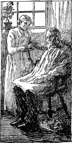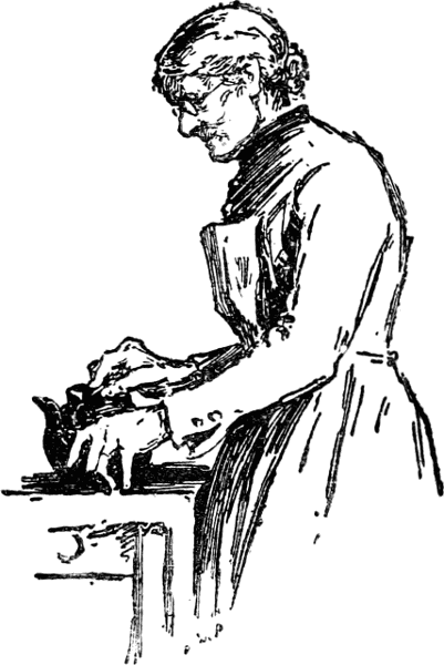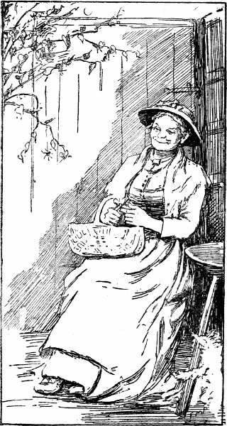 There she sat in the little chapel, her round and ruddy face without a wrinkle in it, all curves and dimples that were the settled homes of good humour and thankfulness; a face snugly surrounded by a black bonnet, set off with a clean white cap. Beside her were her two lads, their faces as clean and shining as plenty of soap and hard scrubbing could make them. You met her going home from the service, the short, round figure wrapped in a thick black shawl, trotting along with her hymn book in one[Pg 32] hand and a big umbrella in the other, short and round like herself. The happy little lads went bounding before her, the three of them the very picture of gladness.