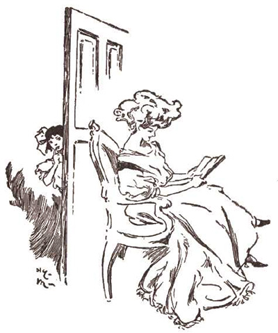 One evening, Maida was lying on the hearth kicking her fat legs in the air and watching the Flame Folk when she heard somebody (you know which one I mean—the one with the white cap and apron) coming. Now of course Maida wasn’t the least bit sleepy and she did not want to go to bed, so she slipped out of the door and down the long hall to the very end. Then she heard somebody talking—oh, such a fine voice somebody had, just like the growl of a bear—but a nice soft growl, mind you—and what the Man with the Growly Voice said must have been ever so funny, for Aunt Mary laughed and laughed. So Maida peeked. There sat Aunt Mary in one of the traily, fluffy dresses, and her pretty neck and arms looked so pink and soft, and her eyes were so bright and her cheeks were so9 red, that Maida envied her clear to the tips of her toes. The Man with the Growly Voice sat oh very close to Aunt Mary, and he was smiling a little and holding Aunt Mary’s hand (Aunt Mary did not seem to mind a bit), then Maida heard him say—“Name the day.”