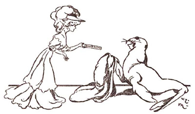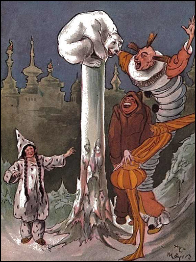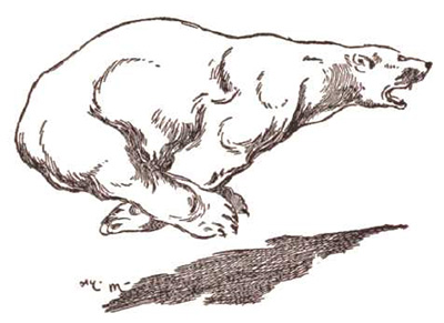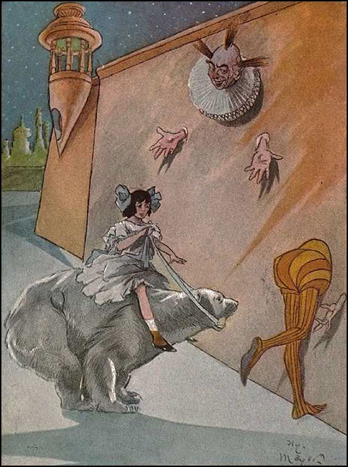 11Then the Man with the Growly Voice told Maida lots and lots of other things,—not stories mind you, true tales. He had been so long in the cold North that he could only sleep in the refrigerator, and he had to eat icicles and snowballs all the time because he was used to them. Then he told her of the Eskimos; funny little tame Indians who guard the North Pole, with great white bears, so no one can steal it,12 and when he dined with them they gave him nothing to eat but ice-cream.