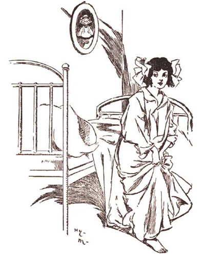 Then there was bedtime. Maida hated to go off to bed as soon as supper was over and leave everyone else up having a good time. Just at dusk when the flames in the fireplace began to dance and glitter and4 flash—and she could see castles and trees and mountains in the coals—SOMEBODY with a white cap and apron would snatch her up and carry her off to a little pink and white room and plump her into a pink and white bed—when she wasn’t a bit sleepy. Maida often meant to rebel at such treatment, but somehow when she cuddled up in the pink and white bed and finished yawning, she overlooked it, and the next thing—it would be morning.