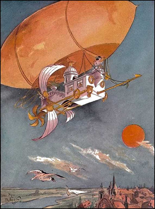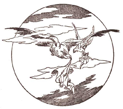 It was great sport to make a long dip downward and just miss the top of a mountain. It was quite a joke to glide along behind an eagle and take him by surprise and watch him flap his wings madly to get out of the way, as she hooted the horn, “hoot, hoot.” Did I tell you that all flying26 ships have horns, just like automobiles? Well they do, to warn the birds and frighten the shooting stars away. Oh, she was having a lovely time.