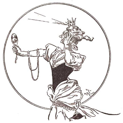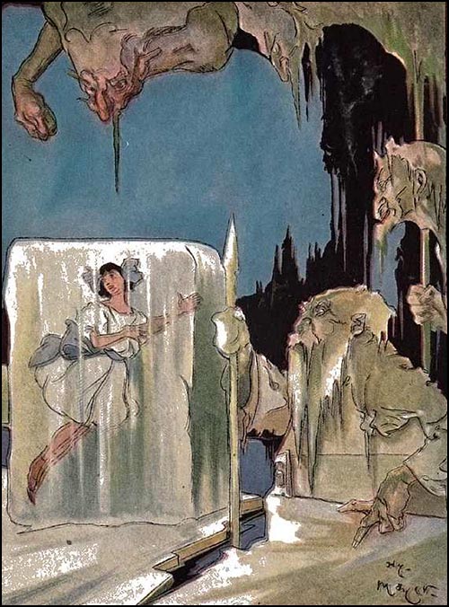 My goodness, how she raged!—and how the red light played! Suddenly her eye lit on Maida and a new idea came to her.190 “That child is a witch!” she screamed. “She has stolen my beauty. If she does not return it, I’ll have her condemned to the Icebergs for life.” (That is just the same as prison for life down here.) “Give me back my angel face,” she howled; “give me back my willowy form.”