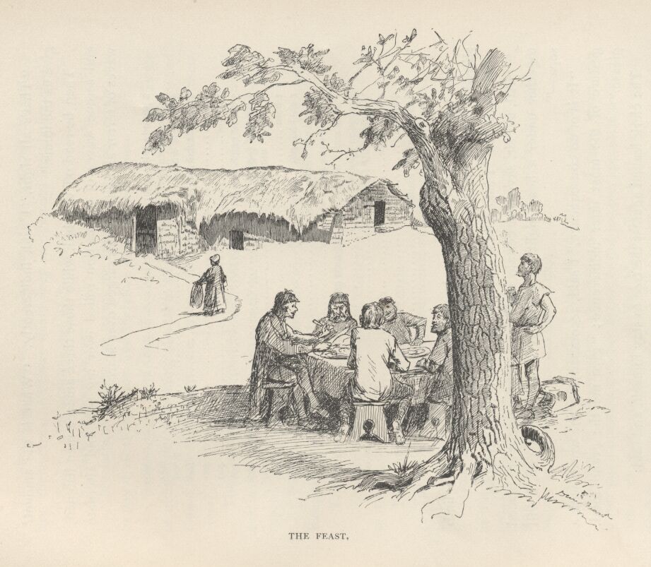 Mainly the Round Table talk was monologues—narrative accounts of the adventures in which these prisoners were captured and their friends and backers killed and stripped of their steeds and armor. As a general thing—as far as I could make out—these murderous adventures were not forays undertaken to avenge injuries, nor to settle old disputes or sudden fallings out; no, as a rule they were simply duels between strangers—duels between people who had never even been introduced to each other, and between whom existed no cause of offense whatever. Many a time I had seen a couple of boys, strangers, meet by chance, and say simultaneously, “I can lick you,” and go at it on the spot; but I had always imagined until now that that sort of thing belonged to children only, and was a sign and mark of childhood; but here were these big boobies sticking to it and taking pride in it clear up into full age and beyond. Yet there was something very engaging about these great simple-hearted creatures, something attractive and lovable. There did not seem to be brains enough in the entire nursery, so to speak, to bait a fish-hook with; but you didn’t seem to mind that, after a little, because you soon saw that brains were not needed in a society like that, and indeed would have marred it, hindered it, spoiled its symmetry—perhaps rendered its existence impossible.