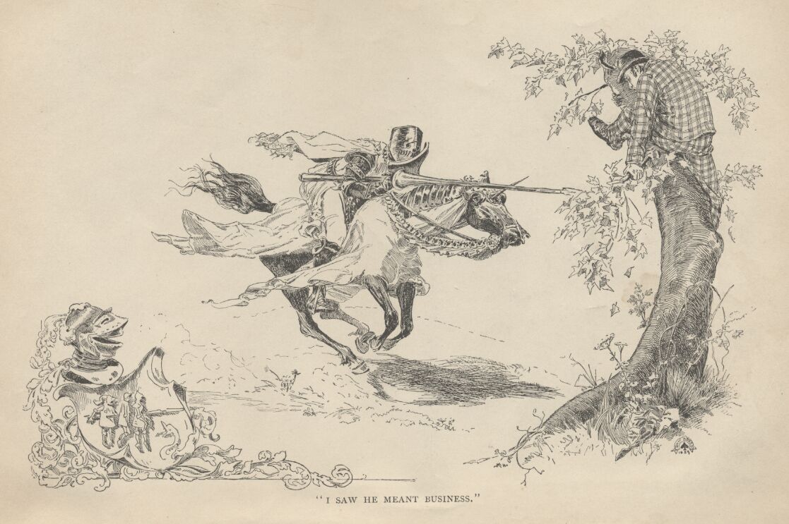 Now what does this man do but fall back a couple of hundred yards and then come rushing at me as hard as he could tear, with his nail-keg bent down nearly to his horse’s neck and his long spear pointed straight ahead. I saw he meant business, so I was up the tree when he arrived.