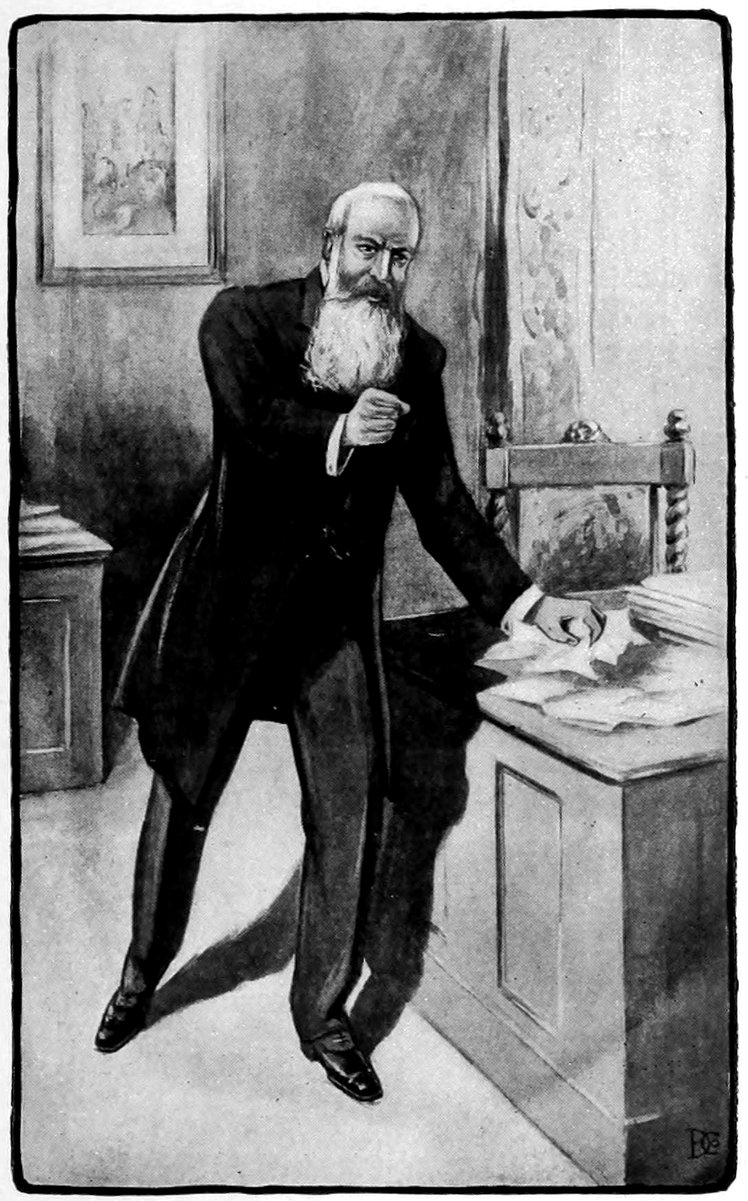 [Throws down pamphlets which he has been reading. Excitedly combs his flowing spread of whiskers with his fingers; pounds the table with his fists; lets off brisk volleys of unsanctified language at brief intervals, repentantly drooping his head, between volleys, and kissing the Louis XI crucifix hanging from his neck, accompanying the kisses with mumbled apologies; presently rises, flushed and perspiring, and walks the floor, gesticulating]