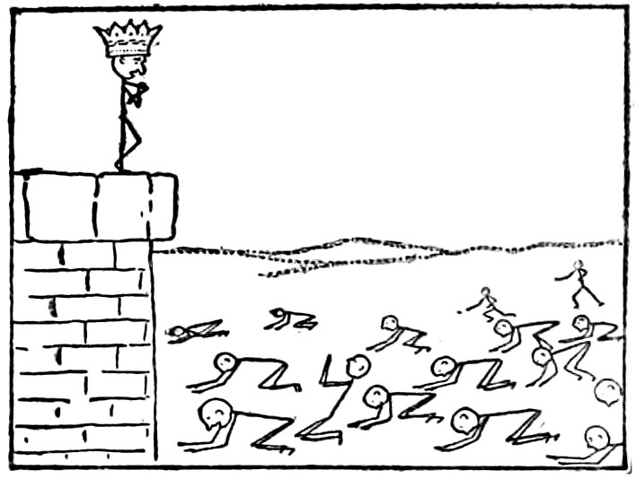 It will make a stir, it surely will, these crucifixions. Persons will begin to ask again, as now and then in times past, how I can hope to win and keep the respect of the human race if I continue to give up my life to murder and pillage. [Scornfully] When have they heard me say I wanted the respect of the human race? Do they confuse me with the common herd? do they forget that I am a king? What king has valued the respect of the human race? I mean deep down in his private heart. If they would reflect, 34they would know that it is impossible that a king should value the respect of the human race. He stands upon an eminence and looks out over the world and sees multitudes of meek human things worshiping the persons, and submitting to the oppressions and exactions, of a dozen human things who are in no way better or finer than themselves—made on just their own pattern, in fact, and out of the same quality of mud. When it talks, it is a race of whales; but a king knows it for a race of tadpoles. Its history gives it away. If men were really men, how could a Czar be possible? and how could I be possible? But we are possible; we are quite safe; and with God’s help we shall continue the business at the old stand. It will be found that the race will put up with us, in its docile immemorial way. It may pull a wry face now and then, and make large talk, but it will stay on its knees all the same.