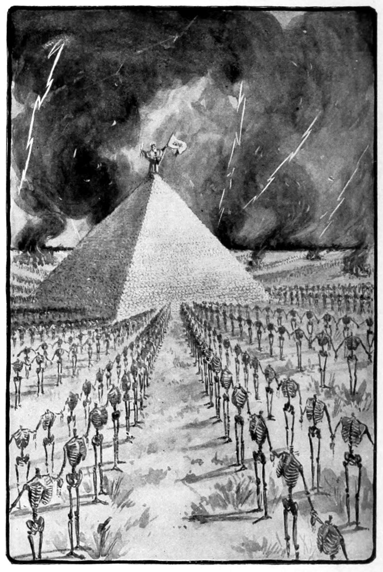Another madman wants to construct a memorial for the perpetuation of my name, out of my 15,000,000 skulls and skeletons, and is full of vindictive enthusiasm over his strange project. He has it all ciphered out and drawn to scale. Out of the skulls he will build a combined monument and mausoleum to me which shall exactly duplicate the Great Pyramid of Cheops, whose base covers thirteen acres, and whose apex is 451 feet above ground. He desires to stuff me and stand me up in the sky on that apex, robed and crowned, with my “pirate flag” in one hand and a butcher-knife and pendant handcuffs in the other. He will build the pyramid in the centre of a depopulated tract, a brooding solitude covered 28with weeds and the mouldering ruins of burned villages, where the spirits of the starved and murdered dead will voice their laments forever in the whispers of the wandering winds. Radiating from the pyramid, like the spokes of a wheel, there are to be forty grand avenues of approach, each thirty-five miles long, and each fenced on both sides by skull-less skeletons standing a yard and a half apart and festooned together in line by short chains stretching from wrist to wrist and attached to tried and true old handcuffs stamped with my private trade-mark, a crucifix and butcher-knife crossed, with motto, “By this sign we prosper;” each osseous fence to consist of 200,000 skeletons on a side, which is 400,000 to each avenue. It is remarked with satisfaction that it aggregates three or four thousand miles (single-ranked) of skeletons,—15,000,000 all told—and would stretch across America from New York to San Francisco. It is remarked further, in the hopeful tone of a railroad company forecasting showy extensions of its mileage, that my output is 500,000 corpses a year when my plant is running full time, and that therefore if I am spared ten years longer there will be fresh skulls enough to add 175 feet to the pyramid, making it by a long way the loftiest architectural construction on the earth, and fresh skeletons enough to continue the transcontinental file (on piles) a thousand miles into the Pacific. The cost of gathering the materials from my “widely scattered and innumerable private graveyards,” and transporting them, and building the monument and the radiating grand avenues, is duly ciphered out, running into an aggregate of millions of guineas, and then—why then, (—— ——!! —— ——!!) this idiot asks me to furnish the money! [Sudden and effusive application of the crucifix] He reminds me that my yearly income from the Congo is millions of guineas, and that “only” 5,000,000 would be required for his enterprise. Every day wild attempts are made upon my purse; they do not affect me, they cost me not a thought. But this one—this one troubles me, makes me nervous; for there is no telling what an unhinged creature like this may think of next.... If he should think of Carnegie—but I must banish that thought out of my mind! it worries my days; it troubles my sleep. That way lies madness. [After a pause] There is no other way—I have got to buy Carnegie.