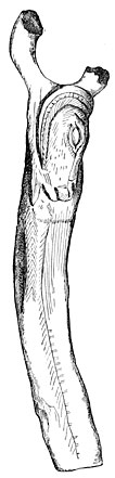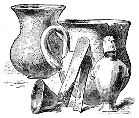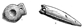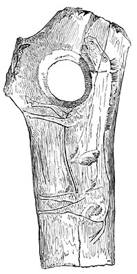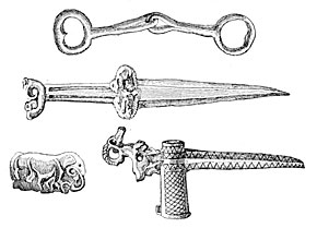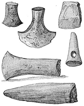 It may perhaps be convenient to introduce a fourth period when copper alone was used and our ancestors were still ignorant of the alloys necessary for the production of bronze. Hesiod speaks of a third generation of men as possessing copper only, and although it does not do to attach undue importance to isolated facts, recent discoveries in the Cevennes, in Spain, in Hungary, and elsewhere, appear to confirm the existence of an age of copper (Fig. 2). We may add that the mounds of North America contain none but copper implements and ornaments, witnesses of a time when that metal alone was known either on the shores of the Atlantic or of the Pacific29 (Fig. 3).