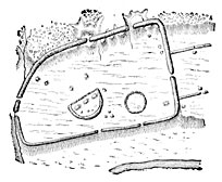 We have seen that men began by placing the bodies of their dead in caves, and only later took to burying them underground when caves were not to be had. Very often the corpse was placed between large unhewn stones to keep off from it the weight of the tumulus above. Such were the last resting-places alike of the men of Solutré and of those of Merovingian times. In the necropolis of Vilanova, which is supposed to date from times prior to the foundation of Rome, the tombs enclosed a chest, the walls of which consisted of slabs of sandstone set on edge and connected by a conglomerate of small stones. At Marzabotto, the chests are made of bricks, and placed beneath a heap of pebbles. We reproduce a chest discovered near the Lake Dwellings of Auvernier in Switzerland (Fig. 106)25 and another (Fig. 107) brought to light by MM. Siret in the south of Spain. These drawings will help us better than long descriptions to form an idea of this mode of burial.