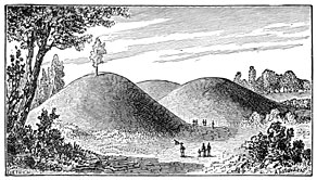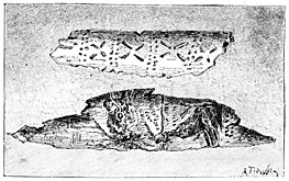 On several parts of the coast of Denmark we meet with mounds of an elliptical shape and about nine feet high, with a hollow in the centre, marking the site of a prehistoric dwelling. It was not until about 1850 that the true nature of these mounds was determined. Excavations in them have brought to light knives, hatchets, all manner of stone, horn, and bone implements, fragments of pottery, charred wood, with the bones of mammals and birds, the skeletons of fishes, the shells of oysters and cockles buried beneath the ashes of ancient hearths. To these accumulations the characteristic name of Kitchenmiddings, or kitchen refuse, has been given.