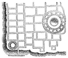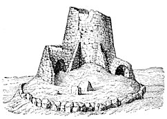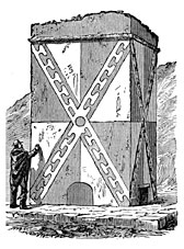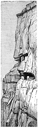 Chulpas, generally of square or rectangular form, consist of a mass of unhewn stones faced outside with blocks of trachyte or basalt, painted red, yellow, or white. A very low door, always facing east, as if in honor of the rising sun, gives access to a cist in which the dead was laid. The chulpa of our illustration (Fig. 105) is situated near the village of Palca; it rises from an excavation four feet deep; its height is about sixteen feet, and the cornice consists of ichu, a coarse grass which grows in abundance on the mountains, and which after being firmly compressed was cut with the help of sharp instruments. The human bones, which were mixed together in the greatest confusion, made a heap in the sepulchral chamber more than a foot high.