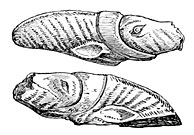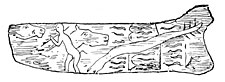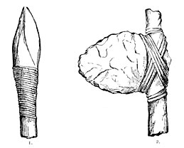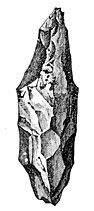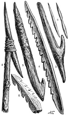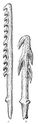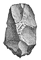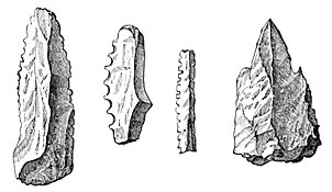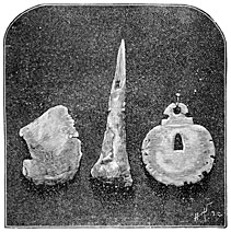 Agates worked by the hand of man are found in great quantities in the bone beds of the Godavery. Some javelin heads in sandstone, basalt, and quartz, with scrapers and knives, most of them flat on one side and rounded on the other, appear to be even more ancient than the agate implements. Some of the celts resemble those of European type, others the flint weapons found in Egypt, and the clumsiest forms may be compared to those still in use amongst the natives of Australia. We may also mention a somewhat rare type lately discovered in the island of Melas, which have been characterized as saw-bladed knives. A letter from Rivett-Carnac announces the discovery of weapons and stone implements in Banda, a wild mountain district on the northwest of India. The scrapers, he says, strangely resemble those of the Esquimaux, and the arrow-heads those of the most ancient inhabitants of America.34