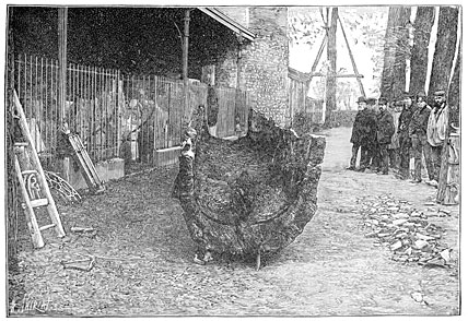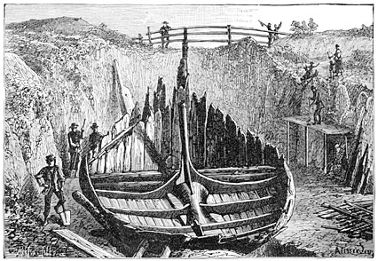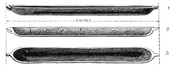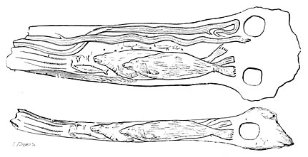 It is probable that early man also turned to account the trees he saw growing around him, using them as coffins for his dead. But the rapid decay of this fragile case led to its total disappearance. A few exceptions must, however, be mentioned. In 1840 some dredgers took from the bed of the Saône, at Apremont, from beneath a bed of gravel five feet thick, the trunk of a tree which still contained the bones that had been placed in it. Similar discoveries were made in the Cher, and in the celebrated cemetery of Hallstadt, near Salzburg. The cairns of Scania covered over split trunks of oak and birch trees, which had been hollowed out to receive the dead. At Gristhorpe, near Scarborough, in England, a coffin was found made of scarcely squared planks roughly put together; and another very like it was discovered at Hove, in Sussex, the latter containing a splendid amber cup, evidence of the wealth of the man who had been buried in this primitive coffin.27