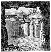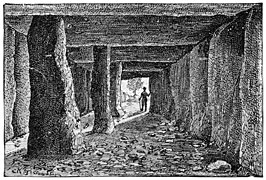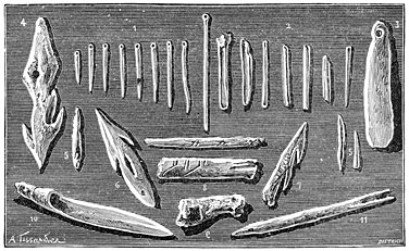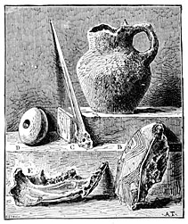 In thus limiting our idea of the stone age, we may conclude that alike in Europe and in America,31 there has been a period when metal was entirely unknown, when stones were the sole weapons, the sole tools of man, when the cave, for which he had to dispute possession with bears and other beasts of prey, was his sole and precarious refuge, and when clumsy heaps of stones served alike as temples for the worship of his gods and sepulchral monuments in honor of his chiefs.