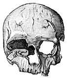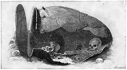 The mounds of Ohio also cover over sepulchral chambers of a peculiar construction, being often formed of round pieces of wood, five to seven feet long by five to six inches in diameter; near the bodies were placed a few ornaments, chiefly copper ear-rings, shell beads, and large flint knives. Most of the skeletons lay on the bare earth; but one exception is mentioned in which the ground was paved with mussel shells. A remarkable discovery has quite recently been made at Floyd (Iowa), the account of which in Nature for January 1, 1891, we will give in the words of Clement Webster: “In making a thorough exploration of the larger mound … the remains of five human bodies were found, the bones even those of the fingers, toes, etc., being, for the most part in a good state of preservation. First, a saucer or bowl-shaped excavation has been made, extending down three and three-quarter feet below the surface of the ground around the mound, and the bottom of this macadamized with gravel and fragments of limestone. In the centre of this floor five bodies were placed in a sitting posture with the feet drawn under them, and apparently facing the north. First above the bodies was a thin layer of earth and ashes, among which were found two or three small pieces of fine-grained charcoal. Nearly all the remaining four feet of earth had been changed to a red color by the long-continued action of fire.” Mr. Webster goes on to describe the various skeletons and says of one of them, that of a woman: “The bones in their detail of structure indicated a person of low grade, the evidence of unusual muscular development being strongly marked. The skull of this personage was a wonder to behold, it equalling if not rivalling in some respects and in inferiority of grade, the famous Neanderthal skull. The forehead, if forehead it could be called, is very low, lower and more animal-like than in the Neanderthal specimen…. The question has been raised how was it that these five bodies were all buried here at the same time, their bodies being still in the flesh.” … Webster adds that the probability is that all but one of them had been sacrificed at the death of that one, who had most likely been a chief.