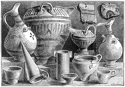 39 In these tombs were found 61 gold objects, 5,574 bronze, 593 iron, 270 amber, 73 glass, and 1,813 terra-cotta. A. Bertrand: Rev. d’Ethnographie, 1883.