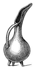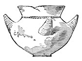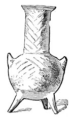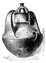 Later, other modes of sepulture came into use. In Marne M. Nicaise made out seven funeral pits22 resembling in shape, he tells us, long-necked bottles with flat bottoms. One of these pits at Tours-sur-Marne contained at least forty skeletons, and among the bones were found thirty-four polished stone hatchets, fifty knives, two flint lance-heads and a great many arrows with transverse edges, a necklace of little round bits of limestone, several fragments of coarse pottery which had been mixed with grains of silica and baked in the fire, and lastly three little flasks made of stag-horn hollowed out in a curious manner and with stoppers of the same material. These quaint little flasks doubtless contained the coloring matter with which the dead had painted their bodies when alive. All the objects of which we have spoken belonged to the Neolithic period; but a flat bronze necklace bead made by folding a thin slice of metal, a radius, and a bit of rib bearing green marks resulting from long contact with metal, appear to fix the date of this pit at the transition period between the Stone and Bronze ages. If this be so it is quite an exceptional case of a sepulchral pit dating from this time, for most of those known are of much later origin. Those for instance of Mont-Beuvray, Bernard (La Vendée), and Beaugency are not older than Gallo-Roman times.23 According to Count Gozzadini, those of Manzabotto in Italy, which are twenty-seven in number, date from the IVth century after the foundation of Rome, and are of Etruscan origin. They are constructed with small pointed pebbles, with no trace of cement, and resemble in shape a long amphora vase, or perhaps, to be more accurate, the clapper of a bell. They are from six and a half to thirty-two and a half feet deep, with an opening varying in diameter from one foot to nearly two and a half feet.24