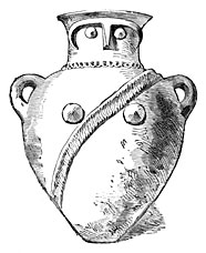 In other cases the dead body was enclosed in earthenware jars. At Biskra in Algeria, two of these jars were found together; the one containing the head, the other the feet of the departed. In some instances the jar was replaced by a large clumsy earthenware basin, some six and a half feet long by three feet wide. Such basins are mentioned as having been found near Athens, but there is nothing to help us to determine their date. The ancient Iberians used one large jar only (Fig. 108) in which the dead was placed in a crouching position, still wearing his favorite ornaments. The vase was closed with a stone cover and placed in the tomb. We meet with the practice of a similar mode of interment in historic times. The Chaldeans placed their dead in earthenware vases; two jars connected at the neck serving as a coffin. Excavations in Nebuchadnezzar’s palace brought to light bodies bent nearly double and enclosed in urns not more than three feet in height by about two feet in width. On the western coast of Malabar, as far as Cape Comorin, we find near megalithic tombs large jars four feet high by three feet in diameter filled with human bones. This mode of sepulture was practised at Sfax, in the Chersonesus of Thracia, and at the foot of the hill on which Troy was built. The tumulus of Hanaï-Tepeh covered over a huge amphora in which crouched a skeleton, and the wealthy Japanese loved to know they would rest in huge artistically decorated vases, masterpieces of native pottery. If we cross the Atlantic, we meet with the same custom in Peru, Mexico, and on the shores of the Mississippi. At Teotihuacan, the bodies of children were placed head downwards in funeral urns,26 and excavations in the alluvial deposits of the Mississippi yielded, among immense quantities of pottery, two huge rectangular basins glued together with clay and containing the body of a young child. It is indeed interesting to meet with the same practice in so many different places and to find the genius of many races expressing itself in the same way in so many diverse inventions, produced at times so widely separated.