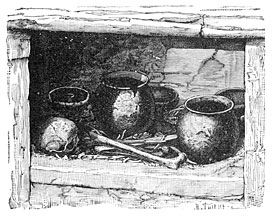 Lastly, to conclude this gloomy catalogue, excavations in the mounds of Ohio and Illinois40 have shown that there too cremation and inhumation are met with in sepulchres which everything tends to assign to the same race and the same period.41 The sepulchral crypts of Missouri contain several skeletons which had been subjected to intense heat. The human bones were mixed with the remains of animals, fragments of charcoal, and pieces of pottery, with sortie flint weapons. In a neighboring mound excavations revealed no trace of cremation; the bodies were stretched out upon the ground, and those who discovered them picked up near them a valuable collection of flints and of carefully made pottery. There is however nothing to show whether those who buried and those who burnt their dead belonged to the same race or lived at the same time. Cremation long survived among the most savage tribes of Alaska and California, where it is still practised, and the Indians of Florida preserve the ashes of their fathers in human skulls. In California, the relations of the deceased covered their faces with a thick paste of a kind of loam mixed with the ashes of the dead, and were compelled to wear this sign of their grief until it fell off naturally.