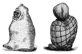 Embalming was also practised in America. Recent travellers report28 having seen in Upper Peru tombs of the shape of beehives, made of stones cemented with clay, each tomb containing one mummy or more in a crouching position (Figs. 109 and 110). This custom was still practised for many centuries; Garcilasso de la Vega tells us that the dead Incas were seated in a temple at Cuzco, wearing their royal ornaments as if they were still alive; their hands were crossed upon their breasts, and their heads were bending slightly forward.29