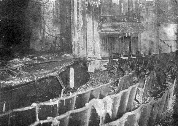 | Great Piles of Charred Bodies Found Everywhere in the Theater—Moan Inspires Workers in Mad Effort to Save—None Left Alive in Gallery—Dead and Dying Carried into Nearby Restaurant by Scores—Terrible Reality Comes to Awestricken Crowd—One Life Brought Back from Death—One Hundred Feet in Air, Police Carry Injured Across Alley—Crowds of Anxious Friends—Balcony and Gallery Cleared—Finance Committee of City Council Acts Promptly. | |
