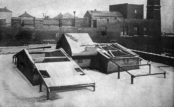 SKYLIGHT ON ROOF OF THEATER, WHICH WAS NAILED DOWN DURING THE FIRE.