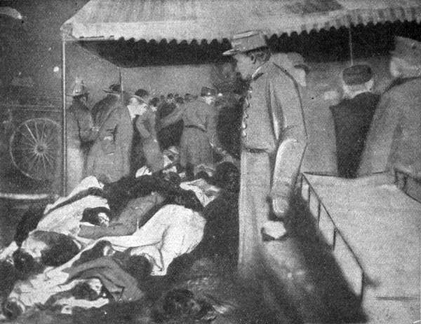 | Wave of Flame Greets Audience—Few Realize Appalling Result—Drop Where They Stand—Many Heroes Are Developed—Dead Piled in Heaps—Exits Were Choked with Bodies—Survey Scene with Horror—Find Bushels of Purses. | |