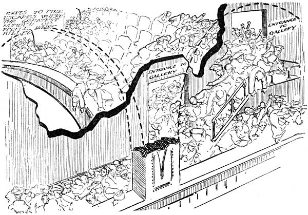 In the theater let it be known that every modern contrivance has been employed to secure safety. Let the curtain be of steel and so arranged that it will have full play to work in its grooves. Let automatic sprinklers be provided. Let the firemen in costume be in plain sight. Let the policemen be in full evidence. Let the aisles always be clear. Let there be ample room between the seats, and let the seats be easily raised to afford rapid departure. Let the ushers be drilled like soldiers to keep their places and allay confusion. All these and other things of like character appeal forcibly to the reasoning powers and tend to give an audience self command.
