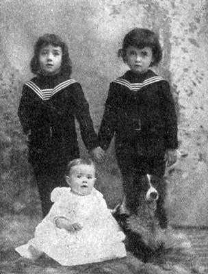 | The three children of William Dee attended the matinee with their nurse. Louise was two years of age and the two boys, twins, Edward Mansfield and Samuel Allerton Dee, were seven years old. Eddie (the boy to the right of the group) and his baby sister were killed. Samuel escaped, but the nurse was found badly mangled, burned and unconscious. |