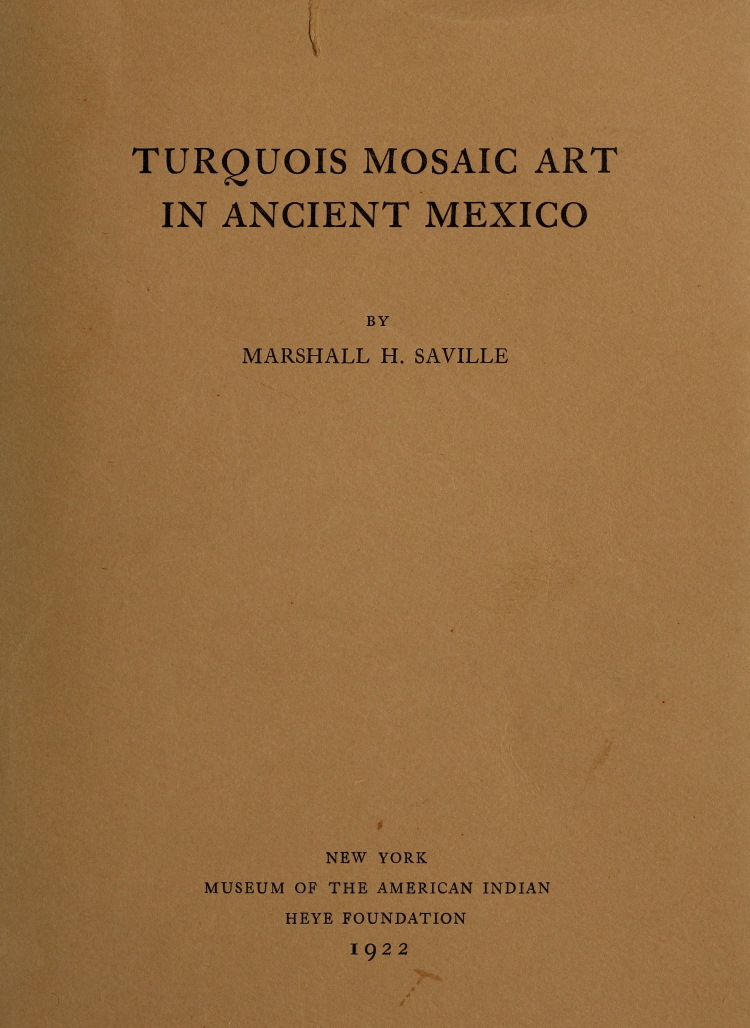 The writer has undertaken the present study of Mexican Turquois Mosaics in honor of the approaching opening to the public of the Museum of the American Indian, Heye Foundation, the only institution devoted exclusively to the study of the aboriginal American peoples ever established; and the proximate International Congress of Americanists to be held at Rio de Janeiro this summer. Owing to lack of time it has been impossible to obtain new photographic illustrations of all the specimens of mosaic-work in European museums, but the author desires to express his thanks to T. A. Joyce, Esq., for his courtesy in furnishing photographs of the examples in the British Museum. To Dr. Franz Heger, of the State Natural History Museum, Vienna, we are under deep obligations for photographs and description of the interesting Xolotl figure preserved in that Museum. Dr. S. K. Lothrop has kindly had photographs made of the objects of this class in the Prehistoric and Ethnographic Museum in Rome, and has made certain valuable observations concerning them. To Drs. A. M. Tozzer and H. J. Spinden special acknowledgment is due for their generous permission to illustrate the mosaics from Chichen Itza, thus anticipating their own description of the objects in the work now being prepared regarding one of the most important discoveries ever made in ancient America. The fine drawings are from the pen of William Baake, and the beautiful plates represent the best efforts of the Heliotype Company. Finally must be acknowledged the characteristic generosity of one of the trustees of the Museum, James B. Ford, Esq., who has made it possible for us to publish this paper, and to whom the Museum is indebted for its acquisition of the precious collection of Mexican mosaics which are now described for the first time.