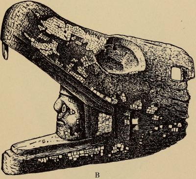 Dr. Peñafiel, in chapter XXIII, under the heading “Incrustaciones de Mosaico,” describes some of the mosaic pieces in Europe which he states are the most important specimens. “Of this class of works the Museo Nacional (Mexico) can count as having only one, in the statue of Coatlicue coming from Tehuacan.” On pl. 26 are given the British Museum knife, and the two knife-handles in Rome; on pl. 117 one of the masks in Rome; on pl. 118(A) the skull mask in Berlin, and (B) the mask in Rome; pl. 123 is the femur musical instrument in Rome; and pl. 168 restorations of the knife-handle specimens with blades, in Rome. These illustrations are all in colors, excepting the last.