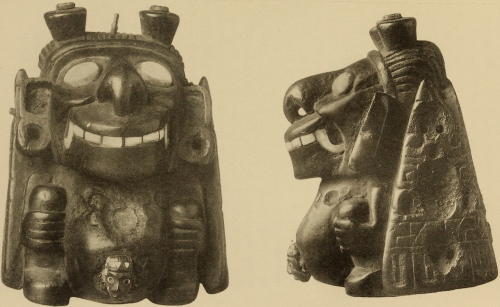 Describes and illustrates two pieces of Mexican mosaics in the Ethnographical Museum of Berlin, a double-jaguar figure, and a jaguar head. The first came[Pg 108] from the estate of Alexander von Humboldt, the second was transferred to the Berlin Museum from the Ducal Museum of Braunschweig.