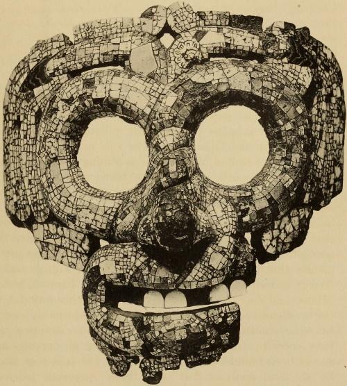 Under the title “Montezuma’s Gifts to Cortés,” Maudslay describes (Appendix, pp. 299-302) and illustrates (pl. 13-16) the three mosaic masks in the British Museum. Pl. 16 is a rear view of the skull mask showing the leather strap by which it was attached to the head. This mask Maudslay identifies as probably that of Tezcatlipoca, and the other two as belonging to Quetzalcoatl.