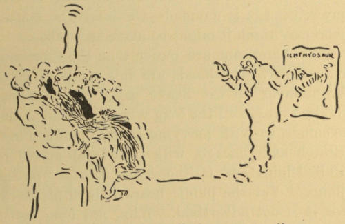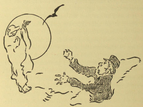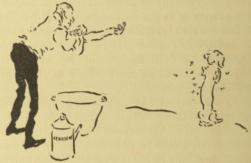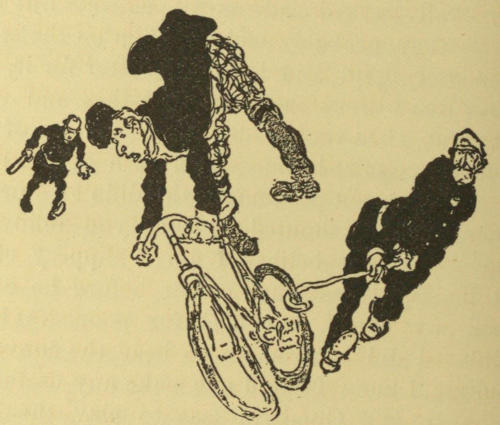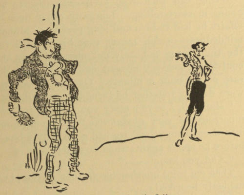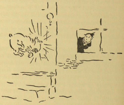 Well, I knocked at her door, after dark, intending to ask for something to eat. She herself opened the door, holding a lamp aloft, to see who the caller might be. Forgetting my disguise, I sprang toward her, after the manner of seven-year old lovers. She shrieked, dropped the lamp—which[350] fortunately went out, and fled down several steps to the kitchen. Her cry of alarm startled a large bulldog, whose existence I had forgotten, but whose voice I recognized as he said distinctly, in dog lingo, “I’m after you.” I took to my heels and ran homeward; he was handicapped by a door that had to be opened for him but I had barely got within my room door when he struck it with the impact of a cart-load of rocks and a roar which I can recall whenever I least want to.