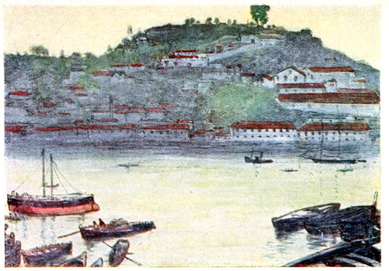 9Along the shore of the busy Ribeira lie ships unloading, small craft they usually are, for the bar of the Douro is a terrible one, and the big ships now enter the harbour of Leixões, a league away. In a constant stream the men and women pass across the planks from ship to shore, carrying the cargo upon their heads or shoulders in peculiar boat-shaped baskets, which are the 10inseparable companion of the Oporto workers. Here is a smart schooner hailing from the Cornish port of Fowey, from which stockfish from Newfoundland is being landed on the heads of women, flat salt slabs as hard and dry as wood, but good nutritious food for all that; and farther along, with their prows to the shore, rest a dozen un-ladened wine and fruit boats from up the Douro, and flat-bottomed passenger skiffs into which women and men with baskets and bundles, representing their week’s supplies purchased in Oporto, are crowding to be carried back to their homes in the rich vineyard villages miles up the river. One by one the quaint craft hoist their crimson sails, and struggle out from the tangle of the bank, until the breeze catches them, and in a shimmer of red gold from the setting sun they hustle through the brown tide until a projecting corner hides them from view. It is a scene never to be forgotten.