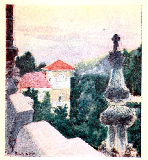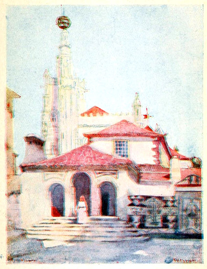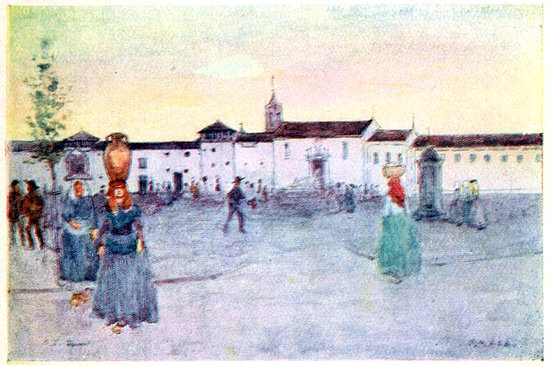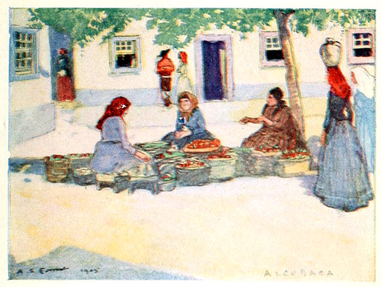Evora was all aglow with the glories of the setting sun when I left it. Long lines of lofty eucalyptus trees stretched as far as the eye reached along the railway, the long hanging strips of bark and the bright clean trunks shining a brilliant orange, whilst the drooping foliage was a bright bronze tipped with gold. Wistaria and clematis hung in wondrous bunches and masses over walls and in wayside gardens, and no sign of coming winter marred the beauty of the day. Long rows of trucks and waggons filled with cork lined the way, and open doors of depôts and warehouses disclosed overflowing stores of cork in bales ready 304for transport; for Evora is the centre of this profitable industry, and derives from it much of its prosperity. Over all the gold and emerald after-glow cast its strange glamour; high overhead the deep blue of the sky was just flecked by purple cloud, and the soft scented air was like a breath from the Arabian Nights.