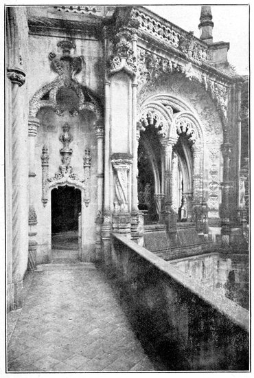 The cloisters of the monastery vie with those of Batalha in beauty, which is saying much. Each of the twenty arches, four on each face 241and one at each corner, is filled with Manueline tracery, exhibiting inexhaustible caprice and invention, no two being alike in pattern; whilst highly decorated Manueline doorways line the inner walls. The upper ambulatory is wider and, if possible, more elaborate than the lower, an unusual arrangement, each upper arch buttress being capped by a beautifully decorated finial. The chapter-house, as usual, leads out of the cloister, an exquisitely rich specimen of Manueline, and is now devoted to the stately tomb of Alexandre Herculano, the nineteenth-century Portuguese historian. Pompous as are the sepulchres of kings and heroes in the adjoining church, this monument to the historian—a respectable figure in literature, it is true, but by no means a genius of universal fame—surpasses them all. Here, alone in the midst of this grandiose chapter-house of the monks, the dead man-of-letters rests more splendidly than monarch or millionaire. Modern Portugal, at least, can honour the gifted pen; for the names of Camões, of Almeida-Garrett, the nineteenth-century poet, and Herculano, the historian, are all through the country commemorated by street names. How long shall we have to 242wait before Englishmen, so ready to bow the knee before successful finance, will thus do homage to an historian? Verily, little as we may relish the truth, we have much to learn from Portugal, and not in this alone.