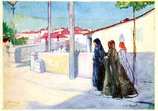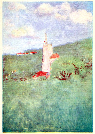 As we wind down the hill again from the poverty-stricken town beneath the castle walls, carts of little black grapes meet us winding up the hill for the belated vintage, and through the open doors of granges we see the wide shallow tubs being filled with grapes trodden under the feet of swarthy lads. The air is soft and close as the sun sets red and orange behind the tree-clad hills, and I pass the hour waiting for the train at Pinhal Novo under a grove of lofty eucalyptus trees, whilst the shrill twittering of millions of cicadas, and the languorous perfume in the air tell me that I have left the strenuous land behind, and am in a clime where to strive is folly.