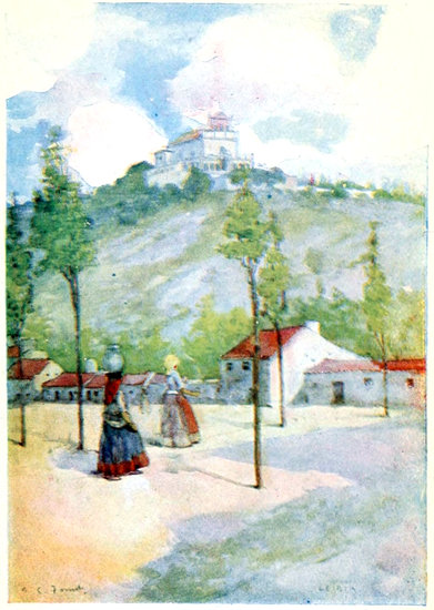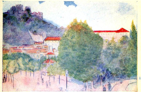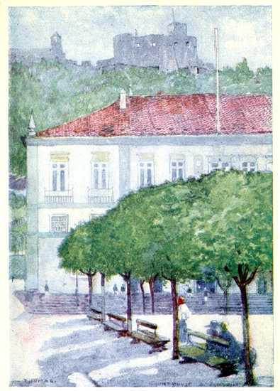 Lisbon is a city of prospects, and, uninteresting as are its main streets, it is only necessary to stand upon one of its many eminences to see spread before you a wide and varied panorama. The end windows of the upper corridors in the Hotel de Bragança afford a splendid view of the port and the mouth of the Tagus, whilst from the ancient citadel of St. Jorge, and from the dome of the big classical church of Estrella, the city and the rolling hills for miles around are spread out at the foot like a map in relief. Speaking for myself, I have always considered one of the most attractive coigns of vantage in Lisbon to be the Largo da Gloria just over the entrance of the Avenida. This can be reached either up the Rua de São Roque or by the funicular lift from the Avenida itself. The view from this pretty public garden on the top of a 244precipitous bluff is charming. The whole of the central valley lies under you with its straight lines of streets, starting from the great parallelogram of the Rocio just below and reaching the Tagus. Just in front of you across the valley rise the hills covered with houses of all colours amidst greenery, with the great old citadel of the Moors and their conquerors crowning the highest point towards the river; the square battlemented towers of the old cathedral being seated upon a lower hill at its foot. To the left an ocean of mountainous hills covered with verdure and buildings stretch as far as the eye reaches; whilst on the right beyond the extensive Black Horse Square shines the wide estuary of the river, and miles away across the water the mountains that bound the prospect towards the south.