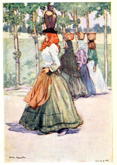 I know few more characteristic thoroughfares than the road by the river-side at Oporto, called the Ribeira, which is the centre of maritime activity of the port. The path runs beneath what was the ancient river-wall, now pierced or burrowed out to form caverns of shops, where wine and food, cordage and clothing are sold to sailor men. Many of the open doors have vine trellises before them, in the shade of which quaintly garbed groups forgather, and a constant tide of men and women flows along the path, eddying into and out of the cavernous recesses in the ancient wall. Colour, flaring and fierce in the sun, flaunts everywhere; for the multi-tinted rags of the south festoon and flutter from every door and window and deck the persons of all the womankind. Swinging along, with peculiar and ungainly gait, go the women with prodigious burdens upon their heads. Everything, from babies to bales of merchandise, is borne upon the female head in Portugal; and these women of the north wear a peculiar headgear adapted to this custom. It is a round, soft, pork-pie hat of black cloth or velveteen, fitting well upon the top of the head, the upper rim being adorned with a sort of standing silk fringe. Such a hat, especially when surmounted by a knot, suffers no damage from a burden placed upon it; but the constant carrying of tremendous weights upon the head of females, even of little girls, quite spoils the figures of the women, thrusting the hips and pelvis forward inordinately, and rendering the movements in walking most ungraceful. The women and girls almost invariably go barefooted, whilst the men, except the fishermen, usually are shod; and the females of a family share to the full the work and hardships which are the common lot.