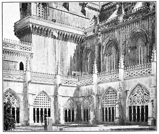 A long line of church and monastery adjoining runs parallel with the sea, the conventual portion partly in ruins but now in course of reconstruction, and the eye is at first perfectly bewildered by the richness of the details of the doors and windows of the edifice. Here Manueline architecture is at its earliest and best, before extravagance like that of the unfinished chapels at Batalha overwhelmed it. Here the orthodox florid Gothic and Renaissance styles are leavened, but not obliterated, by the new spirit of expansion and aspiration that found its national expression in what is called Manueline. The west door of the church, where the monastic buildings join it, is extremely beautiful. On each side are rich canopies under which kneel the king and queen with their patron saints, and smaller figures exquisitely carved surround the rest of the door, which is surmounted by flamboyant pinnacles in the Manueline taste. The general idea of the windows, which are 238very large and high, is of a round-topped arch three or four courses or orders deep, each course being set with bosses of a different, but always elaborate, pattern, an outer moulding representing a twisted cable or twined branches in infinite variety, ending in a series of pinnacles, surrounding the window on the surface of the wall.