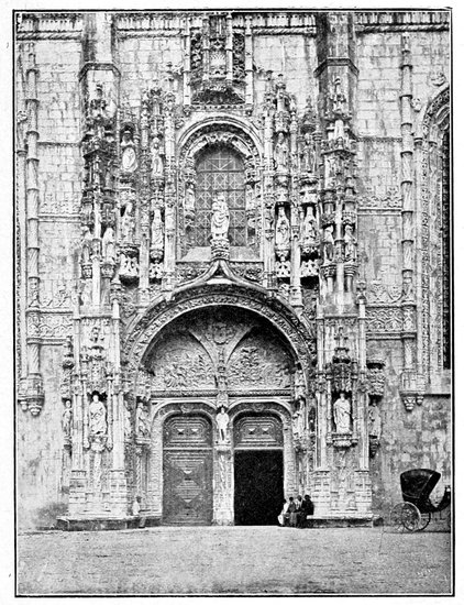 It is a long and tiring walk from here to Belem, but two lines of electric trams go thither, one along the river-bank and the other by the parallel route past Alcantara, and either will serve our turn. Belem is now but a suburb of Lisbon, continuous lines of houses covering the two miles of the route. There still remains, however, something of distinction in this royal village, full of memories as it is of Portugal’s great day of power and wealth. For here it was that at length the dream came true, and those long vigils of the Fortunate King on the savage peak of Cintra were rewarded by the coming of Vasco da Gama to the squat, sturdy old tower of Belem, that had been in his yearning thoughts through so many trials and dangers. King Manuel greeted his great subject, who had brought to his native land the potentiality of wealth illimitable, here in the village of Belem, at the mouth of the Tagus; and as the explorer stepped ashore, the king, overjoyed at his coming, swore to build upon that very spot a Jeronomite monastery splendid enough to be worthy even of that great occasion. And he kept his word; for 237two years afterwards, in 1500, the first course was laid of a building which surpasses all others in its particular style, and in some respects is one of the most remarkable ecclesiastical structures in the world.
