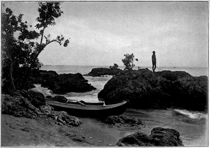When we reached shore, we beached the whaleboat at a favorable spot and, leaving it in charge of a couple of the crew, followed a well-beaten trail that led from the beach to a village near by. At the edge of a clearing surrounded by ramshackle huts, we stopped to reconnoiter.