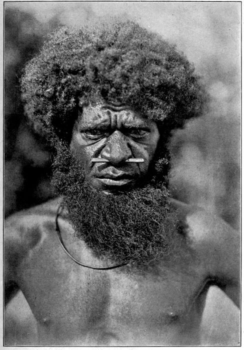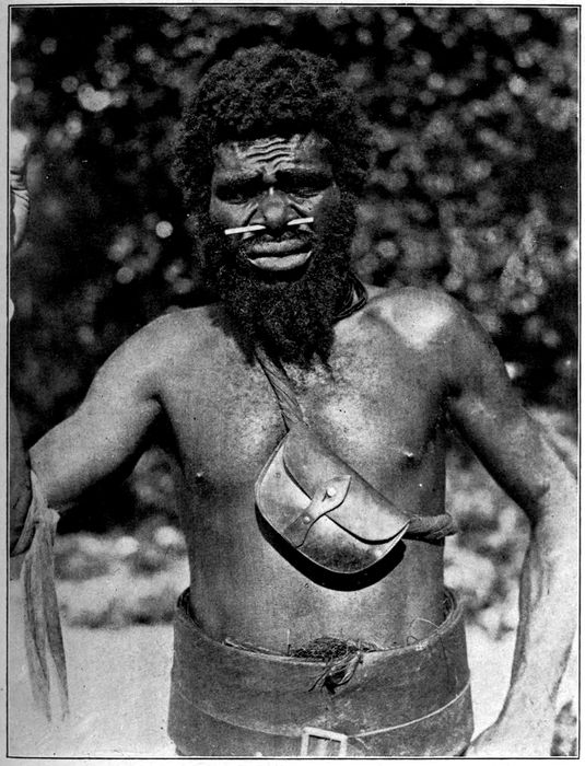 Such nose ornaments are characteristic of the blacks of the South Seas. The Solomon Islander wears a ring fashioned from bone or shell and highly polished and ornamented. The native of Santa Cruz adorns himself with a piece of polished tortoise-shell shaped like a padlock. But the man of the New Hebrides thrusts into his nose anything 181that he happens upon—usually a stick picked up along the trail.