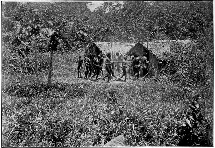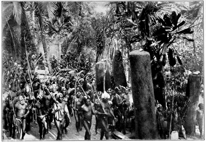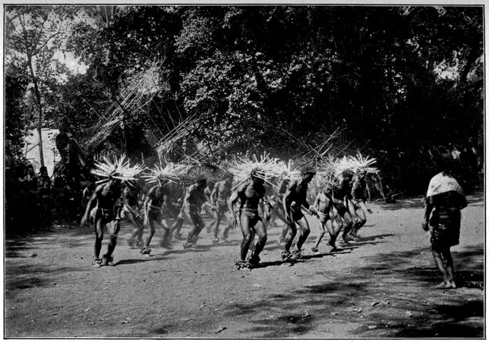 We walked for about three hours without seeing any signs of a village. Then we heard, faint in the distance, the sound of a tom-tom. Soon we were within hearing of a chanted song. We advanced with caution, until we reached the edge of a village clearing. From behind a clump of bushes we could watch the natives who danced there. The dance was just the ordinary native hay-foot, straw-foot, around the devil-devils in the center of the clearing, now slow, now gradually increasing in tempo until it was a run.
