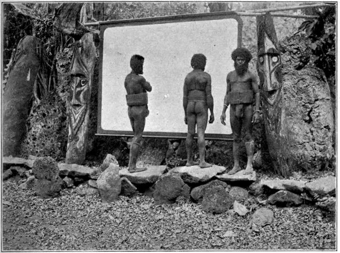 The next day, while I was printing pictures on the beach, a delegation of cannibals appeared on the scene. They were good-natured and friendly. I showed them a big mirror. It was apparently the first they had ever seen. They were awed and puzzled, touching the glass with cautious fingers and looking behind the mirror suddenly, to surprise whoever might be fooling them. I photographed them as they peered at their reflection and grimaced like a bunch of monkeys. We invited them to luncheon. Their favorite dish of “long pig” was not on the bill of fare. But they ate our trade salmon and biscuits with gusto and smacked their lips over the coffee that Osa made for them—the first they had ever tasted. They remained with us until the following 191day, when we picked up our apparatus and sailed off on the first lap of our journey home.