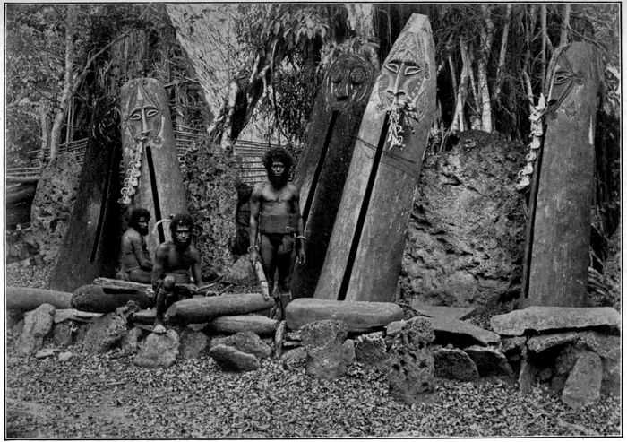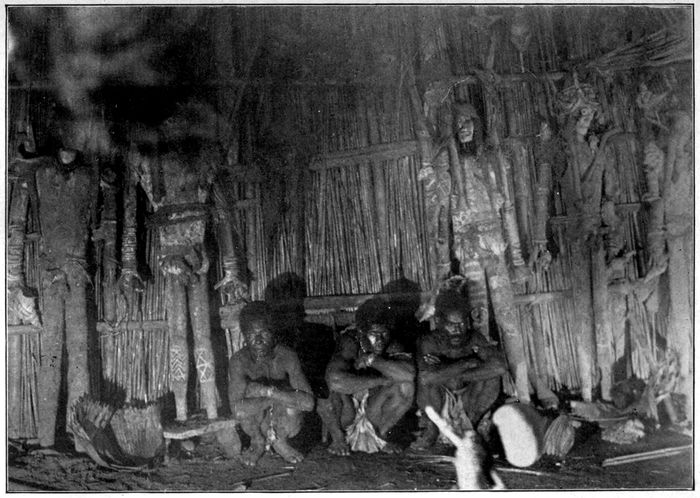 The slaughter of pigs was enormous. I am sure some five hundred must have been killed during the day—far more than could be eaten. As each pig 177was killed, his tusks were removed and placed upon platforms that had been erected to hold them. Pigs’ tusks are always carefully preserved. They ornament the houses. They form necklaces for the devil-devils. They are placed in the crotches of trees.
